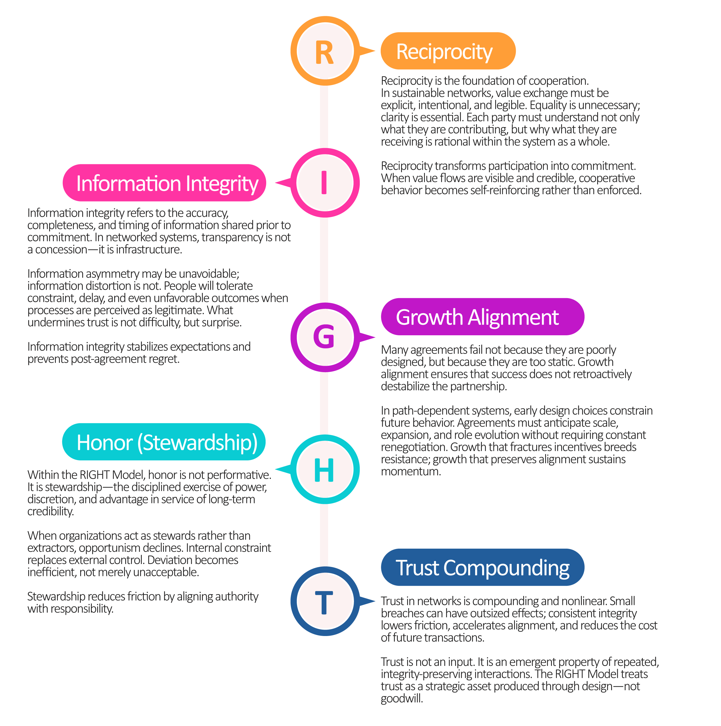 The Anchor Group RIGHT Model is a design framework for building durable, trust-based networks. It reframes “doing the right thing” not as an ethical posture, but as behavioral infrastructure: a way of structuring agreements, organizations, and interactions so that cooperation becomes the rational default.